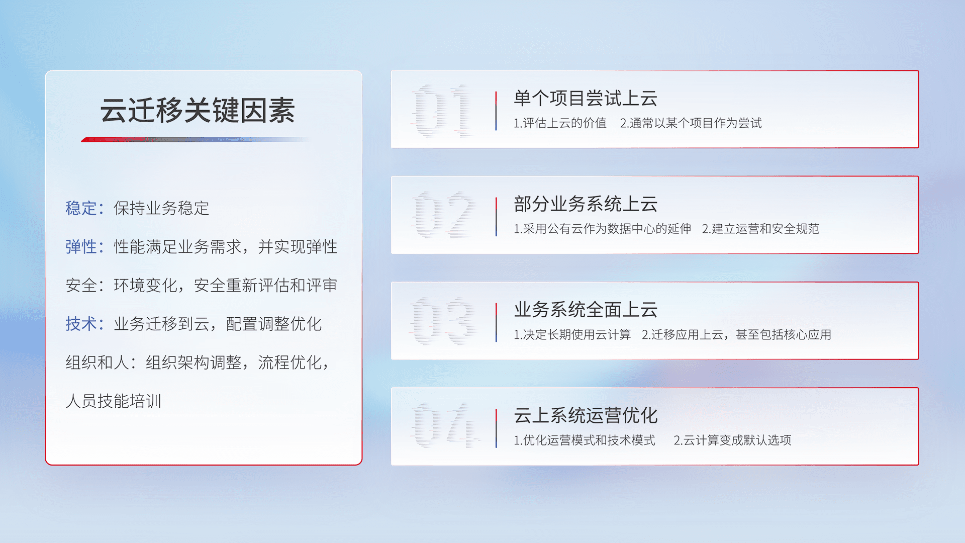 结合实际业务,,,,从规划设计、、、云平台选型、、、、云原生改造、、数据迁移、、集成交付,,,迁移全过程为客户识别最佳上云路径,,,,做好风险识别管理,,设计网络架构、、、、身份权限、、、安全审计合规、、、操作审计、、、、日志审计、、、监控告警策略、、、多站点容灾设计等,,,对云上基础设施进行整体规划,,提升IT治理水平,,以满足弹性、、、高可用、、、、高性能的需求。。。。